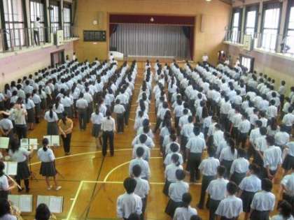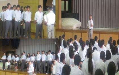 本日2限に体育館で全校集会を行いました。非常に暑い中、みんな集中して話を聞けたと思います。表彰の伝達や生徒会からの取り組みなど盛りだくさんでした。とくに、校長先生からの「心が変われば、行動が変わる。行動が変われば、習慣が変わる。習慣が変われば、人格が変わる。人格が変われば、運命が変わる。」のお話しはみんな真剣に聞いていました。この夏休み、チャレンジの気持ちで何事にもがんばってください!