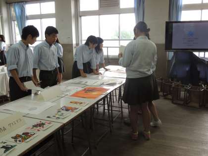 各学年や教科や生徒会・各委員会や各部活動のがんばって制作した力作揃いでした。みんなも一生懸命見学していました。