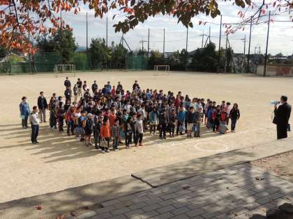 本日、午後に校区3小学校の6年生が旭丘中学校を訪問し、授業や部活を体験する「旭中に行こう」が開催されました。3小学校のみなさんはグラウンドに集合し、校長先生のお話や諸注意を受けてから、それぞれの体験授業の場所に移動しました。