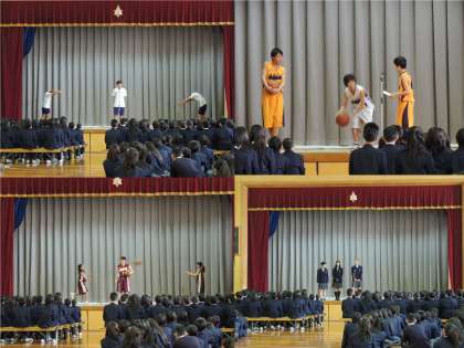 部活動紹介の様子です。1年生は食い入るように見ています。