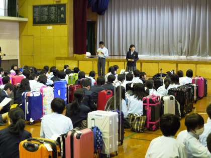 雨の心配をしていましたが降ることもなく,朝早くから3年生は元気に登校してきました。体育館で結団式を行い,136名が心を一つにして,さあ沖縄に向けて出発です。