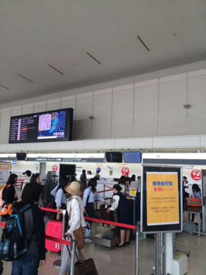 空港で荷物を預けています。もうすぐ出発の時間です。