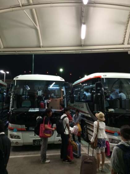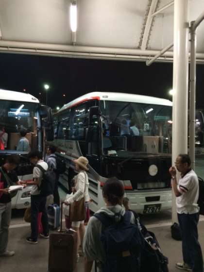 現在,バスに乗車中です。午後8時55分には出発します。