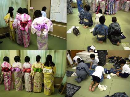 本日,家庭科の授業として,和装教室が行われました。6名の講師の方に来ていただき,浴衣の着付けについて体験しました。生徒たちは皆,自分の手で浴衣を着るのは初めてのようで,楽しみながらも真剣に取り組んでいました。
