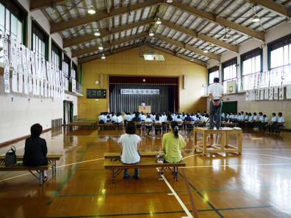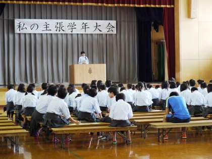 本日,体育館において私の主張学年大会が行われました。1年生は1・2時間目に,各クラスから選ばれた代表者19名が,それぞれのテーマについて発表しました。消費税などの身近な話題を扱ったものから,いじめ・差別・戦争に関するものまで,様々な主張を聴くことができました。