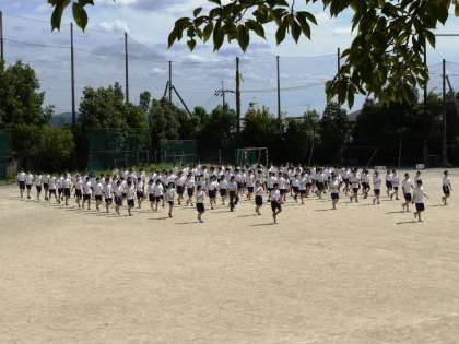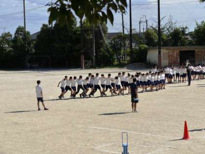 3年生は,5・6時間目に学年合同体育を行いました。入場行進の練習,徒競走の招集練習の後は,いよいよ学年種目「クラス一脚」の練習です。クラス全員がお互いの足を結び付け,二人三脚の要領で走り,タイムを競います。息が合わないと,結んだゴムがはずれてすぐにバラバラになってしまいます。さあ,クラス一丸となって,優勝を目指してください!