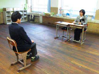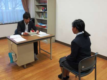 昨日放課後,面接練習を行いました。生徒たちは,扉の開け方や質問への回答,自己アピールなどに,緊張しながらも頑張って取り組んでいました。
