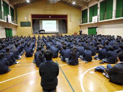 本日午後,本校体育館において全校道徳を行いました。最初は校長先生のお話でした。校長先生は,ラグビーワールドカップ南アフリカ戦の日本チームを例に,「最後まであきらめずに可能性を信じてチャレンジすれば,きっといい結果に結び付く」と語られました。