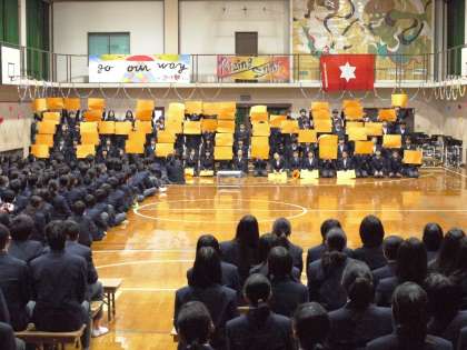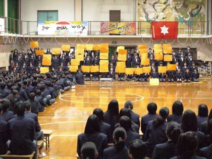 本日午後,「3年生を送る会」が開催されました。この日のために,各学年の生徒たちは,一生懸命練習に取り組みました。1年生は,「THANK YOU」の人文字をつくり,「遥かな季節」を合唱して,感謝の気持ちを精一杯表現しました。