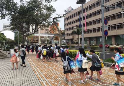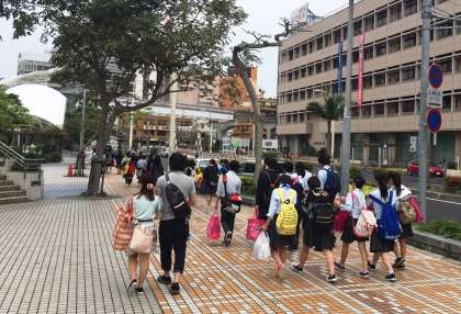国際通りでの班別研修が終わり,ゆいレールの県庁前駅に向かっています。那覇空港ロビーに,12時25分集合です。