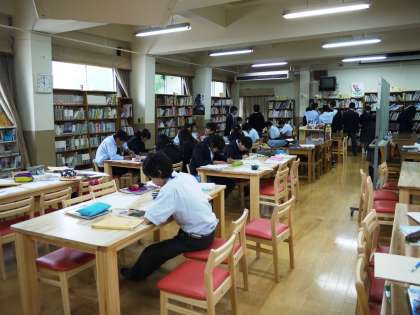 3年生の美術の授業です。「光と影で遊ぶ」という学習で,図書室の資料を用いてステンドグラスの原画のデザインを考えています。みんな集中して取り組んでいました。