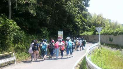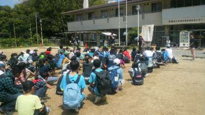 入所式の様子です。友愛の丘での活動の説明や注意点を聞いて,昼食作りにとりかかります。