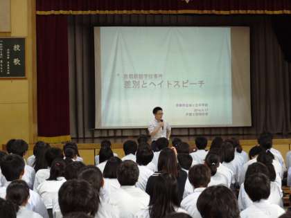 本日午後,1・3年生は人権学習を行いました。1年生はカードゲームを通して「あってよいちがい」と「あってはいけないちがい」を考えることで,お互いを認め合うことの大切さについて学びました。3年生は2人の講師の方をお招きし,ヘイトスピーチなどの具体例を通して,国や文化の違う人たちと共に生きる上で大切なことは何かをお話しいただきました。今日学んだことをしっかりと理解し,今後の学習でさらに深めていってもらいたいと思います。2年生の人権学習は,7月初旬に行う予定です。