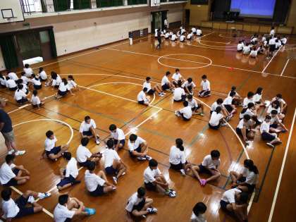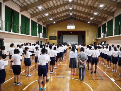 本日3・4限,2年生2回目の合同体育を行いました。前半は体育館で行進練習,招集練習など行い,後半はグラウンドで学年種目「ハリケンGO!」を練習しました。さすがに2年生,息の合ったところを見せてくれました。本番が楽しみです。