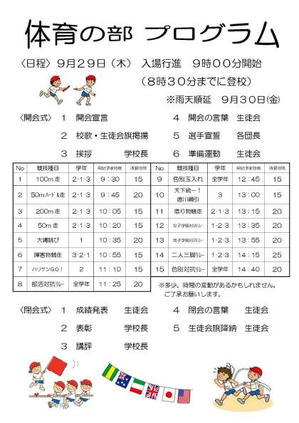 なお「体育の部」のプログラムにつきましては,ページ右下の配布文書または以下のリンクをクリックしてご覧ください。