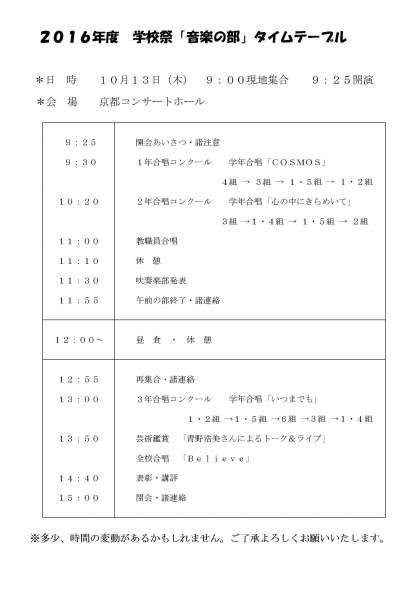 なお「音楽の部」のタイムテーブルにつきましては,ページ右下の配布文書または以下のリンクをクリックしてご覧ください。