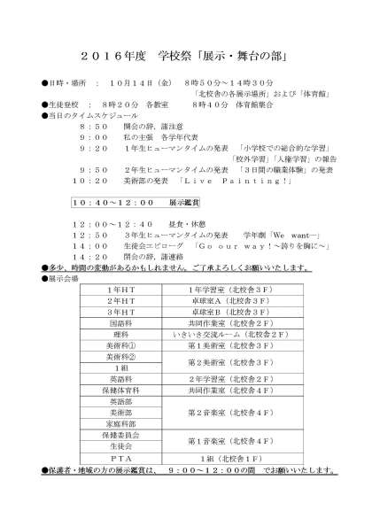 なお「展示・舞台の部」のタイムテーブルにつきましては,ページ右下の配布文書または以下のリンクをクリックしてご覧ください。