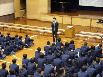 本日6限,熊本市立東町中学校との交流会を催しました。今年の4月,北・上京区の中学校と総合支援学校が,熊本地震の復興支援のために行った募金活動を通じて,東町中学校との交流が始まりました。今日は,東町中学校2年1組37名の皆さんが,修学旅行を機会に,直接感謝の気持ちを伝えたいということで,本校に立ち寄ってくださいました。本校の生徒たちは,心待ちにして準備を整えました。
