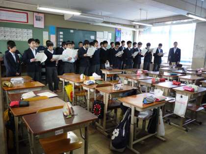 本日5限,1・2年は学活,3年は道徳を行いました。1年生は,送る会に向けて歌の練習をしました。2年生は宿泊学習に向けて折鶴を折ったり,送る会に向けて出し物の練習をしたりしました。3年は「手紙〜親愛なる子供たちへ」を教材に,認知症の親の思いを通して,親子の関係について考えました。