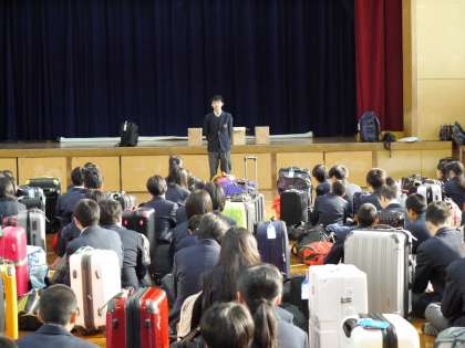 早朝から3年生は元気に登校してきました。体育館で結団式を行い,全員が心を一つにして,さあ沖縄に向けて出発です!