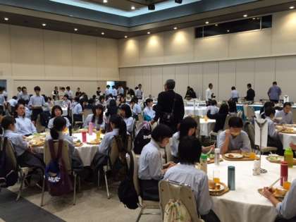 ホテルでの夕食の様子です。みんなおいしそうに食べています。夕食の後は,レクリエーションタイムです。
