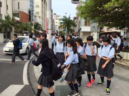 国際通りに到着しました。これから班別研修を行います。国際通りを見学し,12時15分県庁前に集合です。