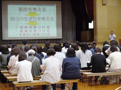 1年学年懇談会と2・3年進路説明会です。学年懇談会では,4月以降の1年生の学校生活の様子を具体的に伝えました。進路説明会では,公立高校の入試制度の概要や昨年度の進路状況について説明しました。入試制度については,毎年変更されている点があります。わからないことについては,遠慮なさらずに質問していただければと思います。