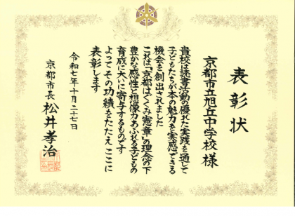 以前にも少しお伝えしましたが、「令和7年度京都市子どもの読書活動優秀実践団体表彰」でこの度、旭丘中が「市長賞」として表彰されました。