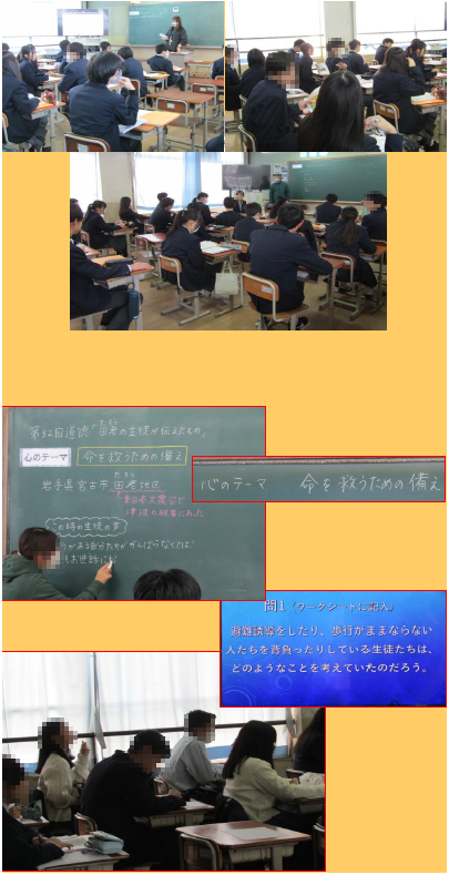 今週の道徳は、1年生は1年間のふり返り、2年生は「田老の生徒が伝えたもの」、3年生はローテーション道徳を行いました。