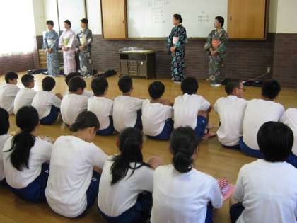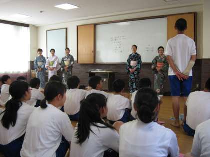 本日1限より着付けの先生に来ていただき、浴衣の着付けをしました。着付けだけでなく作法も教えていただきました。生徒も着慣れていないせいか時間もかかりましたが無事着ることができました。まずは、浴衣についてのお話が先生からありました。その時の様子です。