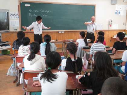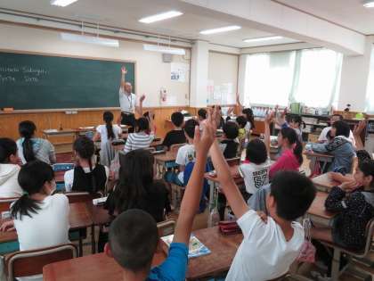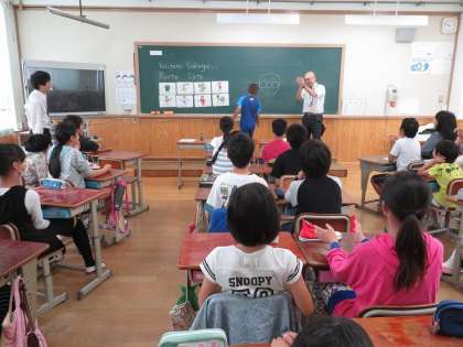 今年度、衣笠中ブロック(柏野小・金閣小・衣笠小・翔鸞小・衣笠中)の新しい取り組みとして、衣笠中英語科教員による「英語出前授業」を実施します。第1回は、昨日金閣小で行いました。授業は、ほぼオールイングリッシュで行いましたが、6年生の児童は一生懸命に授業を受けていました。夏休み後、3小学校でも実施します。これからも4小1中が一つになり9年間の連続した学びを推進していきます。