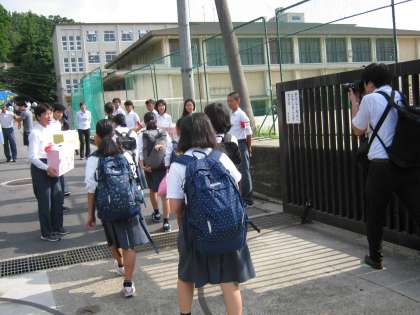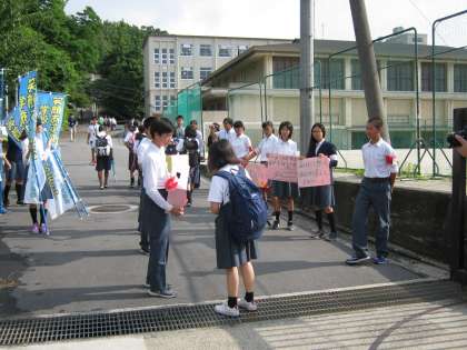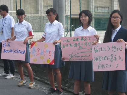 北区・上京区の中学校・総合支援学校の9校の生徒会は、昨年度の「熊本地震」に続き義援金募金活動を行います。衣笠中生徒会は、本日と19日(水)8時から8時20分まで校門で行います。本日京都新聞の取材も受けました。その時の様子です。