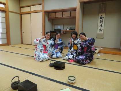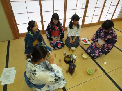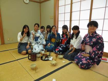 茶道部は部員12名で夏は浴衣姿で活動している生徒もいます。今日は、美味しいお茶を点てていただきました。お茶を点てる作法や礼儀もしっかり身につけています。来週は、衣笠デイサービスを訪問します。お茶を点ててお年寄りの方々といい交流をしてください。