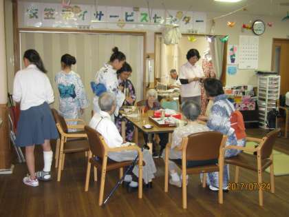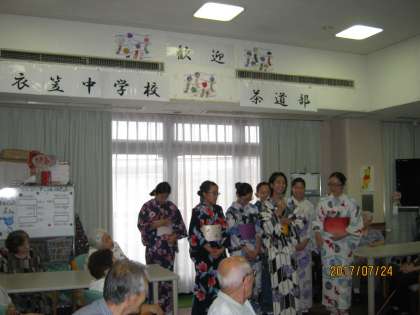 茶道部は中学校に東にある「衣笠デイサービスセンター」に出向き、日頃の練習の成果を披露しました。普段は校内で活動しておることの多い茶道部ですが、講師で指導に来ていただいている先生と共に浴衣姿に身を包み、デイサービスセンターの方にお点前を披露しました。中には涙ぐむ方もいらっしゃいました。部員たちも自分たちの活動が喜んでいただけて、すごく満足でした。