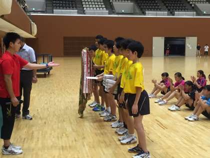 本日、島津アリーナで行われました。1回戦から苦戦しながらも勝ち進み、決勝では強豪春日丘中と対戦して3−1で勝利し見事優勝しました。おめでとうございます。よくがんばりました。