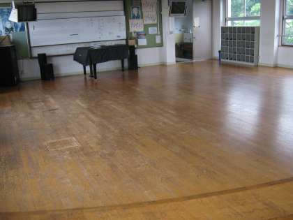 京都市各支部の管理用務員さんが一堂に集まり、毎年夏季研修共同作業を実施されています。北支部では衣笠中学校に支部の方が4日間、教室の床の樹脂加工と木の枝の剪定作業を実施していただきます。写真は作業前の状況です。
