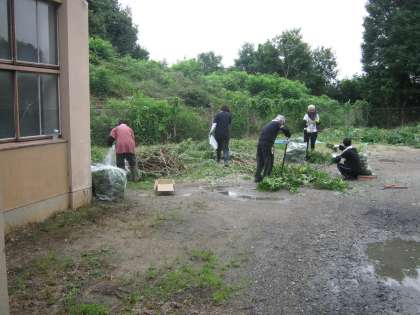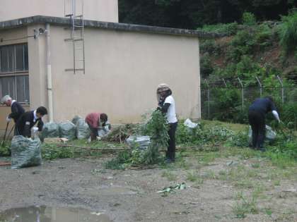 事前に用意された専門の道具を使用され、どんどん木の枝や伸びた草を刈って行かれます。その出際の良さにびっくりします。見る見るきれいな状態になっていきます。ワックスがけも本日は8つの教室を一気にワックスがけされてピカピカになりました。すごい湿気の中汗だくになりながら作業されていました。本日から4日間ありがとうございます。お世話になります。