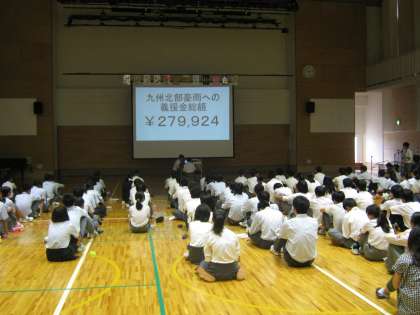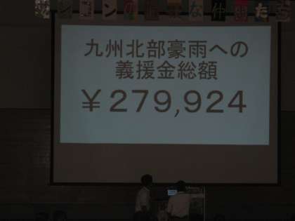 そして、シンボルマークの投票が行われました。その結果、本校の大岡君(3年生)のキャラクターが選ばれました。このキャラクターは北上支部代表候補として8月22日(火)に行われる中学生会議で発表されます。また、九州北部豪雨災害の義援金の総額が発表されました。総額279,924円でした。ご協力ありがとうございました。