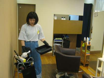 スフィーダ美容院での様子です。店内の掃除と接客をしていました。