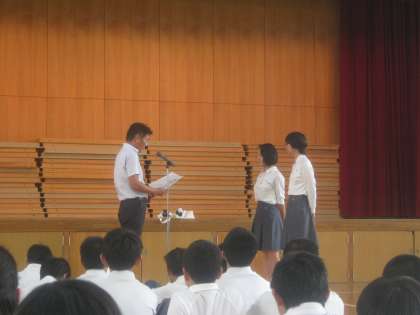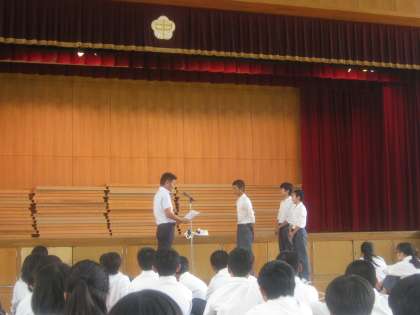 次に、校長先生からのお話です。先日地域で下校中に地域で体調を崩され困っておられた方を助けた3名の3年生の生徒、衣笠中学校キャラクター「きぬごん」のデザインをしてくれた生徒、そして、きぬごんの着ぐるみを作ってくれた美術工芸部に表彰状が手渡されました。