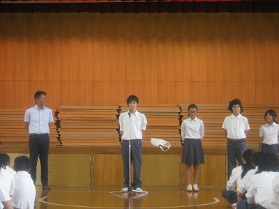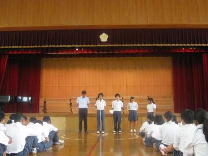 次に学年の代表者が話しました。1年生は、ファイナンスパーク学習で学んだこと。2年生は、チャレンジ体験学習で学んだこと。3年生はこれからの行事に向けての決意をそれぞれしっかりと発表してくれました。