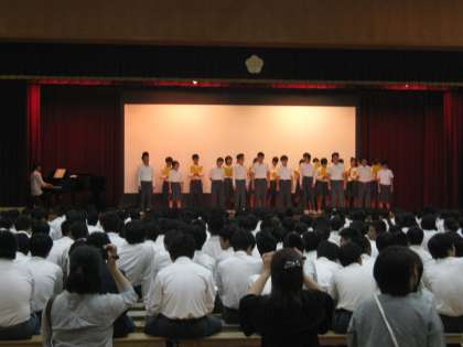 そして、9、10、11組の発表がありました。ハンドベルの演奏の後、3年生の有志の生徒との合唱でした。曲は「威風堂々」でした。とてもすてきな合奏と合唱でした。