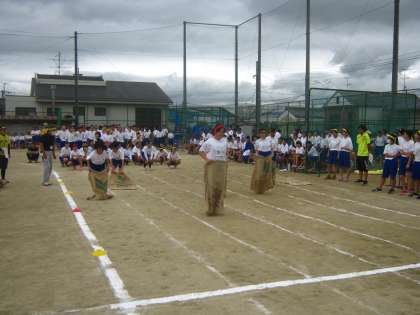 続いて衣笠走です。まず麻袋に入ってジャンプしながら走ります。続いてフラフープをくぐり、ハードルをくぐります。最後に紙に書かれたお題に答えゴールします。まずは、1年生女子の様子です。