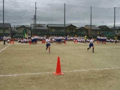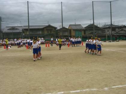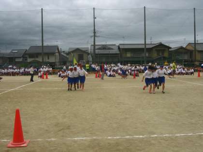 続いて、1年生学年種目「色々リレー」が行われました。往復走→3人4脚→ムカデ→往復走→4人5脚→ムカデというふうにバトンをつないでいくレースです。各クラスの体育委員からクラスに声をかけ、レースが始まりました。結果は1位が1年2組でした。