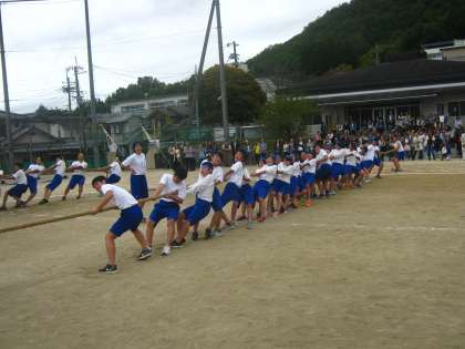 次に3年生による学年種目「綱引き」が行われました。各クラスの体育委員からクラスに声をかけ、綱引きが始まりました。結果は3年6組が1位でした。