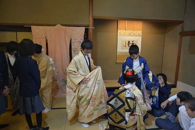 続いて、それぞれのクラスごとに体験学習を行いました。1組は着物の着付け体験をしました。