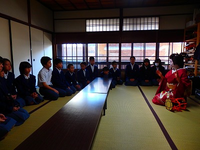 2組は稽古場の見学をしました。そこで鼓をたたかせてもらいました。きれいな音を出すことが難しく一苦労したみたいです。