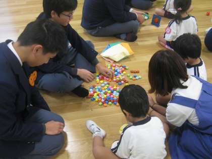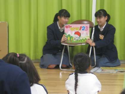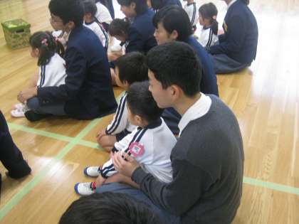 自己紹介が終わると、最初のプログラム「紙芝居」です。中学生の上に、かわいらしくお座りをして聞く園児さんもいました。「紙芝居」が終わると、今日のために中学生が作った手作りのおもちゃを持参しました。楽しく遊んでくれることを考えて、作りました!!