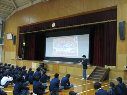 次に現生徒会から7月におこった九州北部豪雨災害で被災された朝倉市立比良松中学校からの義援金のお礼の手紙の紹介と災害を受けたときの状況の報告、12月に2年生が修学旅行で京都に来られ、その際本校を訪問されることの報告がありました。