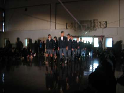 まず、各クラスで決めた曲で3年生が入場しました。たいへん盛り上がる入場でした。続いて1年生の群読と合唱の発表、2年生の群読と合唱の発表、生徒会本部より「部活動後輩からのメッセージビデオ」の上映、3年生の群読と合唱の発表がありました。どの学年も素晴らしい発表でしたが、特に3年生の合唱は気持ちのこもった素晴らしい合唱でした。そして、最後に全校合唱を行いました。
